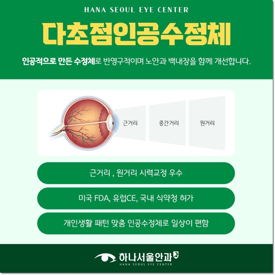 노안과 백내장을 함께 교정하는 데 다초점인 공수체가 놀라운 효과를 제공한 것은 사실이지만 언제든지 정답이라고 할 수 없습니다. 모든 수술은 부작용의 가능성을 고려하는 것이 필수이며, 인공 수정체의 경우 야간 빛 번짐에 주의할 필요가 있습니다만. 또는 녹내장, 망막질환, 동공이상 등의 기저질환에 의하여 사용이 제한될 수 있으므로 안전한 결과를 위해서는 전문의와 충분한 상담 후에 결정하여야 합니다.