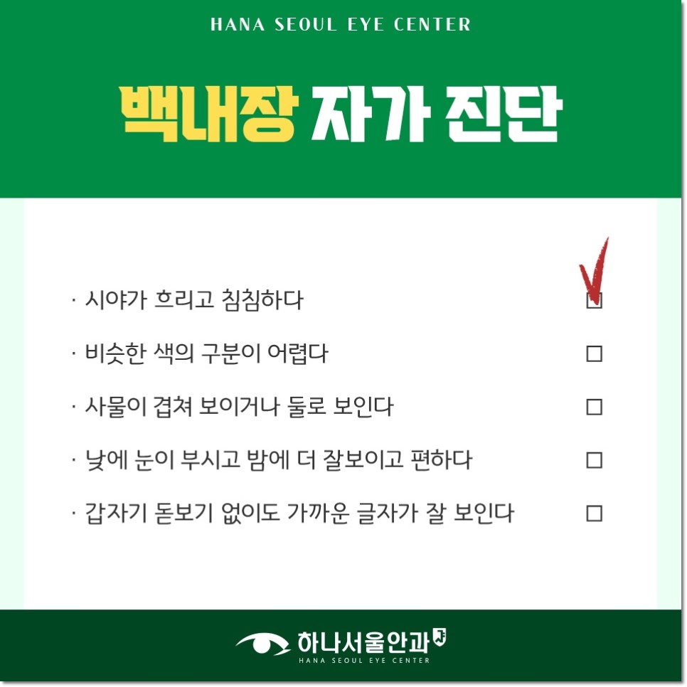 항상 건강할 거라고 생각했던 눈이 어느새 뿌옇게 흐려 보이기 시작했다면 백내장이 됐을 가능성이 있습니다. 해당 질환은 안구의 수정체가 탁해져 시력장애를 일으키는 것이 특징이며 사람마다 발병 원인과 증상의 정도가 다릅니다. 처음에는 시력 문제 이외에는 큰 이상을 느끼지 않지만 점점 사물이 겹쳐 보이는 복시현상이나 눈부심, 번쩍이는 등 평소와는 다른 시야를 경험하면 정밀검진을 받는 것이 좋습니다.