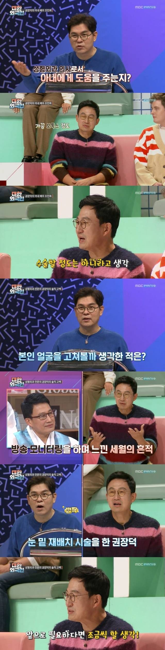 [뉴스에는 서윤아 기자]권장덕이 정형외과 전문의로서 아내 조민희의 외모에 대해 이야기했다.지난 12월 22일 방송된 MBC every1 예능 ‘대한외국인’ 167회는 ‘브로맨스 세 친구’ 특집으로 꾸며져 가수 홍서범, 아나운서 손범수, 정형외과 전문의 권장덕 그리고 부팀장 역할을 맡은 가수 정다경이 출연해 퀴즈 대결을 펼쳤다.이날 홍서범, 손범수, 권장덕은 모두 퀴즈 프로그램 우승 경험이 있어 ‘퀴즈 어벤져스’로 불렸다. 세 사람은 이를 증명하듯 워밍업 퀴즈 ‘무슨 말인지 알지?’에서 10점을 내 손쉽게 산삼 획득에 성공했다. 여기에 부팀장 정다경까지 도라지 힌트 획득에 성공하며 힘을 보탰다. 정다경은 힌트 획득 활약 후 6단계에서 탈락했다.하지만 서울대 의대 출신 권장덕이 이변의 역사를 썼다. 고학력자로 1단계에서 탈락한 것이다. 박명수는 홍삼이 힌트를 사용해 이런 권장덕에게 또 한 번 기회를 줬다.2단계에서 문제를 맞혀 마침내 제 실력을 발휘하기 시작한 권장덕은 어느새 입담도 선보였다. 권창덕은 김용만이 아내 조민희 외모에 정형외과 의사로 도움을 준 적이 있느냐는 질문에 “가끔 보톡스 정도”라고 답하며 “우리가 하는 수술은 아직 할 정도는 아니다”고 평했다.이어 그는 “본인도 나이가 들면서 이걸 해야 한다. 생각해 본 적이 있느냐는 물음에 유자 장사가 나올 때 보면 남들은 몰라도 자신은 아는 부분이 드러났다. 그래서 수술을 했다고 깜짝 고백했다. 권장덕이 받은 수술은 눈 밑 재배치였다. 권장덕은 “앞으로도 필요하면 조금씩 할 생각”이라며 의사 섭외까지 미리 해놨다고 농담했고, 또 홍서범 역시 이미 눈 밑 재배치 수술을 받은 사실을 폭로해 웃음을 선사했다. 권장덕은 5단계에서 탈락했다.홍서범은 대한민국 1호 래퍼로서 ‘김삿갓’ 노래에 대해 이야기했다. 그는 노래를 발매할 당시 “우리나라에 없던 장르라 우리나라 가요계가 뒤집힐 줄 알았다. 하지만 안타깝게도 내 마음은 뒤집혔다. 처음 듣는 노래잖아. 노래인데 멜로디가 없으니까 심의하시는 분들이 음정 불안하다고. 심의가 이뤄지지 않았다고 토로했다. 그는 ‘김삿갓’ 노래를 선보이기 위해 재심 청구를 하는 등 우여곡절이 있었음을 고백했다. 현재까지 실험적인 노래를 이어가고 있다는 그는 6단계에서 아쉽게 탈락했다.손범수 아나운서가 마지막 도전자로 나서자 아내 진양혜 아나운서가 언급됐다. 가족끼리 모두 친하게 지내는 홍서범은 진양해가 우아해 보인다는 김영만의 말에 “같이 노래방에 가면 진양해가 테이블 위에 제일 먼저 올라간다”고 폭로해 눈길을 끌었다.손범수도 아내 폭로에 나섰다. 아나운서 부부라면 옳은 말, 예쁜 말만 쓰겠지만 이는 편견이라고 한다. 그는 부부 사이에 한 집에서는. 아니, 모든 부부가 그렇잖아. 집에서 모습, 밖에서 모습 차이가 있잖아”라고 에둘러 아내의 진상을 전했고, 김영만은 위기를 감지하고 “여기까지 하겠다”며 더 이상의 말을 가로막아 웃음을 자아냈다. 손범수는 이날 7단계에서 탈락해 외국인 팀에 패배했다.한편 권장덕은 1997년 5살 연하의 배우 조민희와 결혼해 슬하에 1남 1녀를 뒀고, 손범수는 1994년 동료 아나운서 진양혜와 결혼해 슬하에 아들 2명을 두고 있다. 홍서범의 아내는 가수 조갑경으로 둘 사이에는 1남 2녀가 있다.