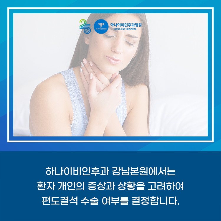 만약 편도 결석 냄새가 자주 재발해서 일상 생활에 지장이 있는 경우에는 편도 결석 제거 수술을 할 수도 있습니다. 하나이비인후과 강남본원에서는 최대한 비수술적 치료를 시행하되 환자 개인의 증상과 상황을 고려하여 편도결석 냄새 수술을 시행합니다. 1년에 3~4회 이상 고열을 동반하는 편도염이 발생하거나, 한번 발생하면 증상의 정도가 심하거나, 편도가 비대하여 코골이 및 수면장애가 나타나면 편도결석수술을 시행합니다.