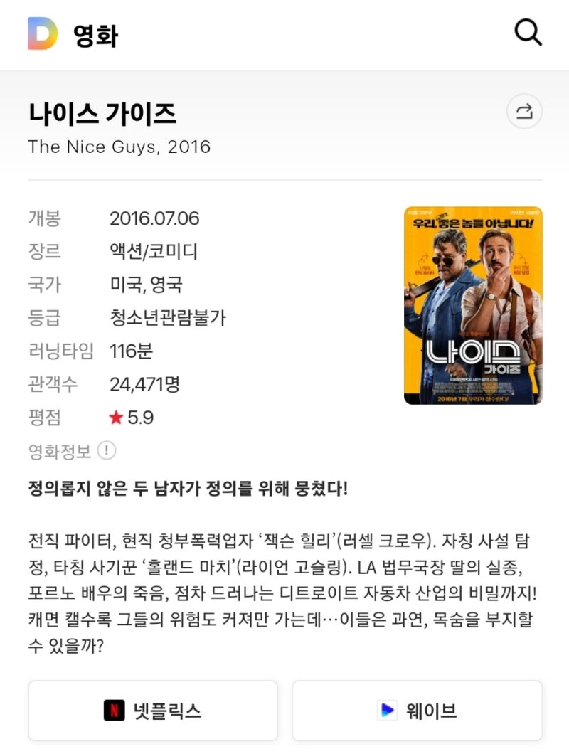 글을 통해 내가 직접 시청해 본 나이스이즈 영화에 대해 알아봤다. 사실 정말 재미있게 봤는데 해외 사이트 평점도 높은 줄 처음 알았어. 그만큼 다른 분들도 재밌게 보셨다는 반증이 아닌가! 요즘처럼 밖은 폭우로 웃을 일이 별로 없는 시국. 그럴 때 보니까 좋은 코미디 영화 추천 작품이라고 느꼈어. 물론 별로라고 생각하시는 분들도 계실 수 있지만 저 같은 경우는 만족하면서 봤다. 믿고 보는 라이언 고슬링, 러셀 크로우