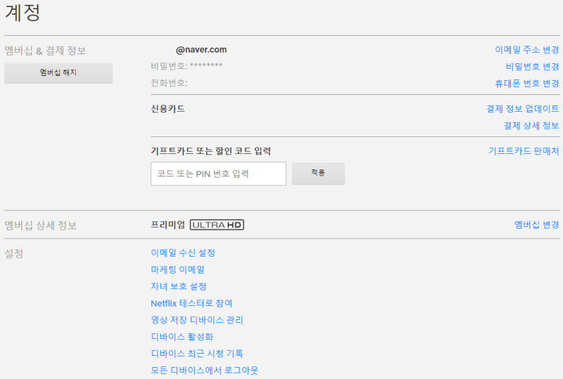 그러면 이렇게 내 이메일과 비밀번호, 전화번호, 결제 정보 등 내 계정 정보가 담긴 페이지가 나타납니다.여기까지 오신 분들은 거의 다 끝났습니다!