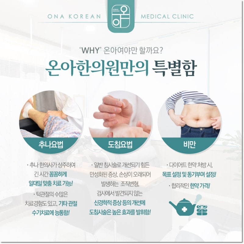 치료시간이 짧아서 같이 회복기간도 빠르다고 합니다.도침요법의 원리연조직이 유착되어 있는 경우는 도침을 통해 이 유착을 박리하여 본래의 동적 상태로 복구시킵니다.또 혈류가 막혀서 통증이 생기는 경우도 종종 있는데요.도침요법을 통해 병소 부위에 막힌 혈류를 소통시키고 기혈의 흐름을 순조롭게 하여 통증을 제거하고 기능을 회복하도록 돕습니다.도침은 일반 침에 비해 더 빠른 효과를 나타낼 수 있습니다.또한 만성적인 인대 유착이나 손상 등 비교적 오랫동안 치료해야 하는 질환의 치료 기간을 단축하는 데도 도움이 됩니다.물론 무조건 도침을 시술하는 것은 아닙니다.통증 때문에 대구 북구 야간진료 한의원을 방문하시면 우선물리적 검사체 열진단기 검사통해 통증의 원인을 파악합니다.체열진단기의 경우 각종 질환으로 인한 통증 부위를 객관적으로 시각화할 수 있는 장비입니다.더 자세히 말하면 통증 부위나 통증 분포 형태, 한열 등을 진단할 수 있습니다.처음 내원하셨을 때 이 검사를 통해 현재 상태를 파악하고 치료를 받는 과정에서 중간에 검사를 통해 처음 상태부터 변화된 부분을 모니터링하여 비교 분석이 가능합니다.비침습적인 방법으로 반복 검사가 가능하므로 걱정하지 않으셔도 됩니다.어린이나 임산부, 조영제 부작용이 있는 환자 등 누구나 실시할 수 있습니다.단, 만약을 위해 담당 의사와 상의하여 결정하는 편이 좋습니다.검사 후에는 통증의 원인이 되는 장소에 대해 시각적이고 객관적인 상담을 실시합니다.상담 진행 시 치료 목표를 설정하고 목표에 맞게 치료 계획도 꼼꼼히 세웁니다.이때 필요에 따라약침구 요법등을 추천하는군요.내원할 때마다 환자에게 필요한 치료를 진행하면서 통증을 개선하고 관절의 움직임을 개선하는 데 도움이 되는 운동치료도 함께함께 가고 있고, 평소 집에서도 할 수 있도록 스트레칭을 지도하고 있습니다.대구 북구 야간진료 한의원에서 시행되는 도침요법은 비교적 다양한 증상에 적용할 수 있습니다.먼저 머리와 목 근처에 통증을 느끼는 경우에 대해 말씀드리겠습니다.만성적으로 두통을 느끼시는 분, 어지러움을 자주 느끼시는 분, 안면마비만성적으로 두통을 느끼시는 분, 어지러움을 자주 느끼시는 분, 안면마비목디스크, 일자목, 버섯목, 삼차신경통오신 분들에게도 침 치료를 활용하여 치료를 실시합니다.최근에는 손목이나 손에 통증을 느끼는 분들도 많죠.손목과증후군, 방아쇠수지, 만성건초염, 손가락관절염등에도 도침 시술이 도움이 될 수 있기 때문에 이런 증상이 있는 분들은 수술적 치료를 먼저 살피지 말고 대구 북구 야간진료 한의원 온아한의원에서 비수술적 도침요법을 고려해 보는 것이 좋습니다.등에도 도침 시술이 도움이 될 수 있기 때문에 이런 증상이 있는 분들은 수술적 치료를 먼저 살피지 말고 대구 북구 야간진료 한의원 온아한의원에서 비수술적 도침요법을 고려해 보는 것이 좋습니다.어깨 통증은 보통 운동을 많이 하시는 분들이나 50대 분들에게 많이 발생합니다.만성적으로 어깨 통증이 있거나 오십견, 어깨충돌증후군, 회전근개파열, 석회화성근건염인 분들에게도 도침요법이 긍정적으로 작용할 수 있습니다.마찬가지로 테니스 엘보나 골프 엘보 등 팔꿈치 통증이 있는 분에게도 침 치료를 권장하고 있습니다.허리디스크, 허리협착증 등 요통이 있는 경우에도 침 치료 시 효과가 있습니다.고관절통, 좌골신경통, 만성대퇴통, 만성미골동통이 있는 경우에도 도침요법을 권장합니다.마지막으로 퇴행성관절염, 족저근막염, 아킬레스건염, 무지외반증, 만성발목인대 통증에도 도침요법이 효과를 발휘할 수 있으니 만성통증을 느끼신다면 더 이상 방치하지 마시고 대구 북구 야간진료한의원인 온아한의원 금호점에서 상담을 받으시길 권합니다.침치료는 네이버예약으로 신속하게상단 배너를 클릭하시면 연결됩니다. 더 많은 정보는 홈페이지를 통해상단 배너를 클릭하시면 연결됩니다. 온아한의원 금호점 의료진 소개 (3인)진료 시간 안내위치 및 주차장 안내온아한의원 금호점 대구광역시 북구 내곡로 38301호온아한의원 금호점 대구광역시 북구 내곡로 38301호온아한의원 금호점 대구광역시 북구 내곡로 38301호온아한의원 금호점 대구광역시 북구 내곡로 38301호