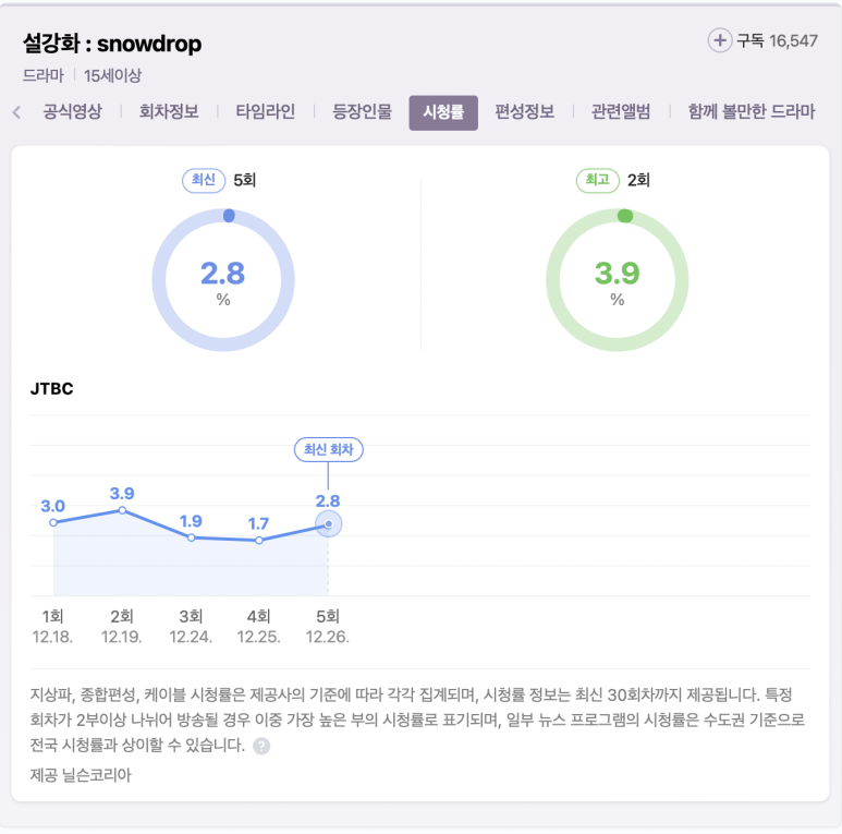 실제로 어제 방송한 5화의 시청률이 소폭 올랐지만 1, 2회에 비하면 비참한 수준이고, 일요일에 이렇다 할 경쟁작도 예능도 영화도 없었는데 사람들이 나름대로 틀어놓은 수치라고 생각되는 것은 의미가 없지 않나 싶다. 특히 설강화의 낮은 시청률이 더욱 처참한 것은 JTBC 플랫폼을 제외하고 설강화를 볼 수 있는 다른 통로가 유일하게 디즈니플러스라는 점 때문이다.