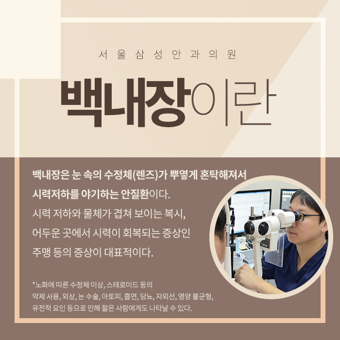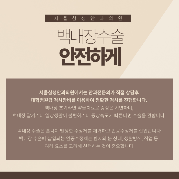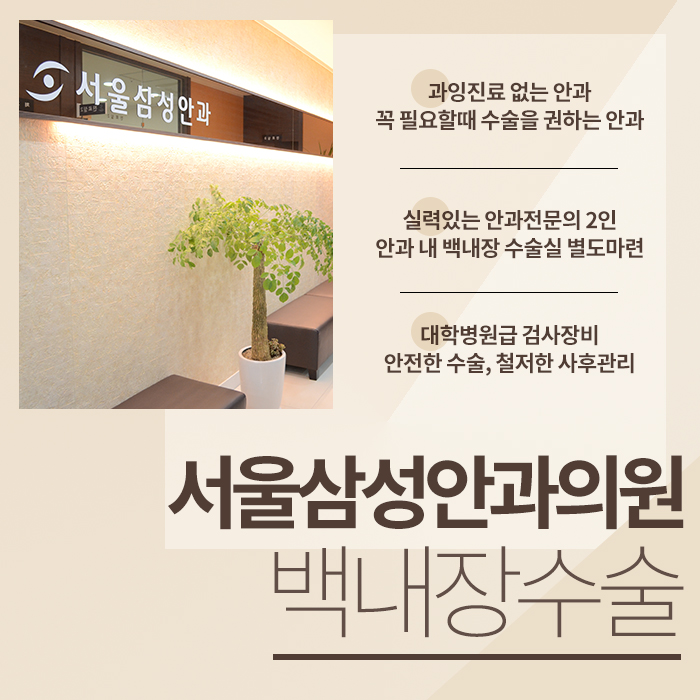 백내장 수술로 고민하죠.유명한 안과에도 많이 다녀보고 비교를 잘해서 골라보세요.서울 삼성안과의원에는 백내장 수술 경험이 풍부한 안과 전문의원장이 2명 있습니다.삼성서울병원 출신 의료진으로 일산 백병원 안과 교수를 지냈고 성형안과 세부전문의원장 등 실력 있는 원장들입니다.