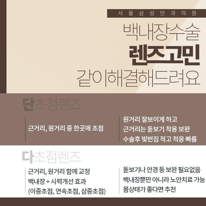 백내장 렌즈 크게 단초점 렌즈와 다초점 렌즈를 선택하셔야 합니다.