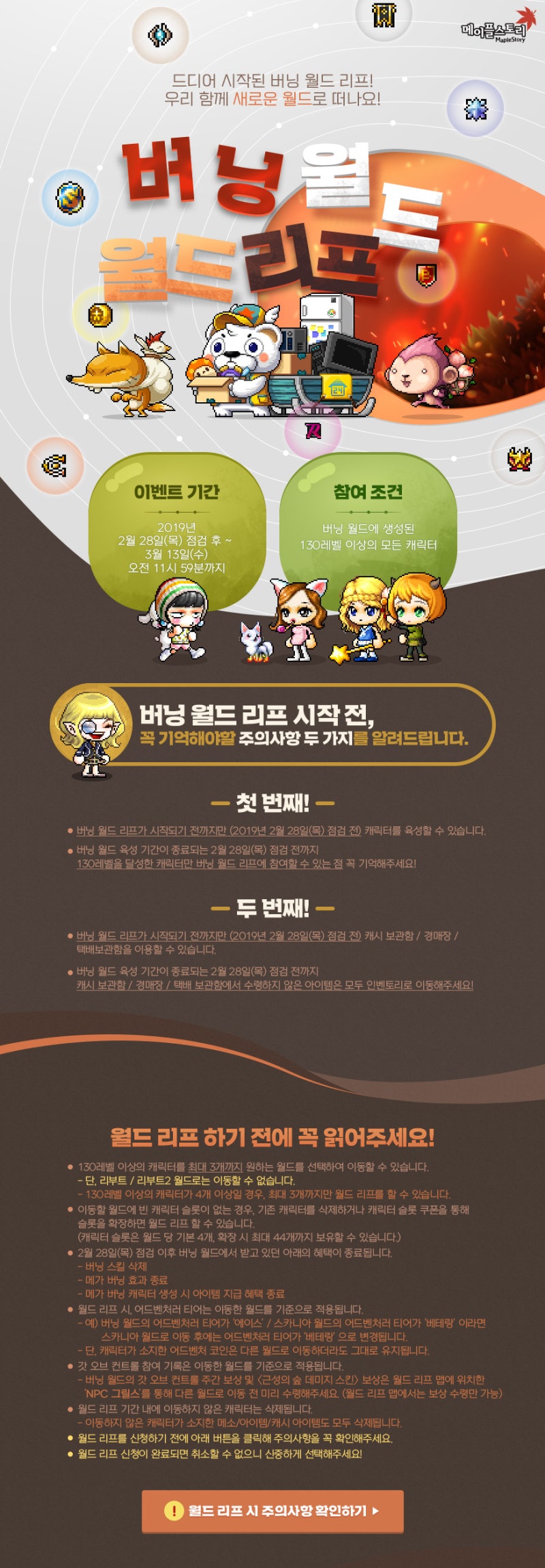 월드리프는 리부트, 리부트2를 제외한 모든 월드 중 하나로 이동할 수 있으며, 이 기간 내에 옮기지 않으면 캐릭터가 없어지므로 잊어서는 안됩니다!