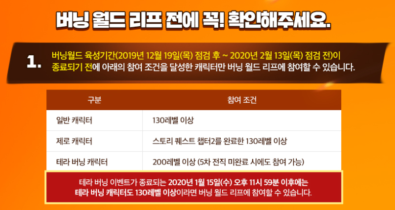 버닝월드에 있는 내 캐릭터에 접속하면 캐릭터가 버닝리프존에 올 거예요. 오른쪽에 보시면 육성기간이 끝나고 130레벨부터 리프가 가능하다고 나와있죠?