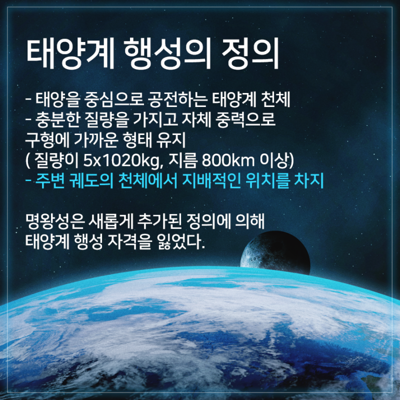 2006년 국제천문연맹 총회에서 정한 태양계 행성의 기준이 있습니다.1. 태양 주위를 공전하는 천체일 것 2. 독자적인 중력으로 구형을 이룰 수 있을 정도의 질량을 가지고 있을 것 3. 궤도 주변의 잡동사니 잔재를 흡입할 수 있을 정도의 지배력(중력)을 가지고 있을 것
