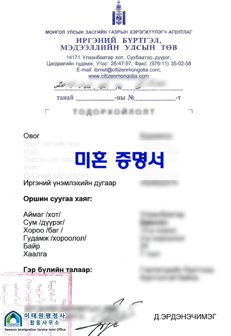 몽골혼인신고 미혼증명서 발급, 국제결혼 절차