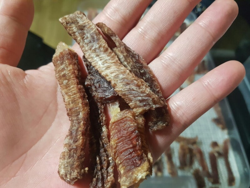 <보관방법> 닭가슴살 수제 육포를 만드신 후 보관은 냉동실에 보관하시다가 전달하실 때 한두 개 정도 꺼내서 전자레인지에 살짝 돌리시거나 직접 뜯으시면 돼요! 평소 물을 잘 마시지 않는 반려견의 경우 따뜻한 물에 육포를 조금 넣어주시면 자주 마신다고 합니다. 이렇게 수분이나 음료수를 채우는데도 간식을 사용해서 충전할 수 있겠네요!