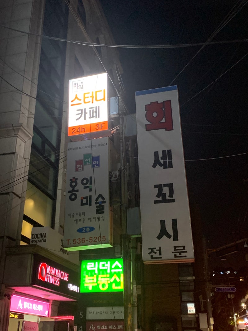 원래 이쪽 길을 가끔 다니는데 보니 횟집 위에 예쁜 빛이 새더라구요~! 현수막을 보니 새로 생긴 것 같네요. (웃음)