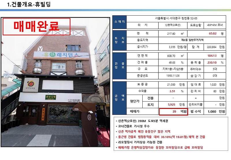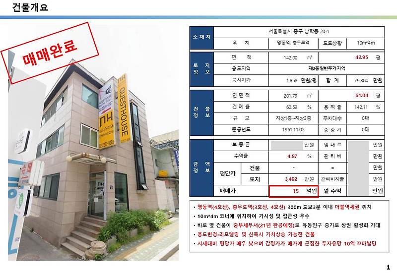 매매가 보증금 월세수익 1억5천900만원 22억원
