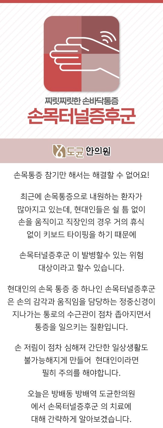 손목터널증후군은 손목의 정중신경(median nerve)이 압박을 받아 발생하는 질환입니다.손목터널은 손바닥 쪽에 있는 좁고 섬유질이 많은 통로로 정중신경(median nerve).TH를 포함한 몇 가지 힘줄과 신경을 캡슐화하고 보호합니다.이러한 신경 압박은 이러한 부위에서 쓰리고, 저리고, 통증을 초래합니다.손목터널증후군은 손목터널 내 조직을 자극하거나 부풀리는 반복적인 움직임이나 장시간 자세(전화기 잡는 것과 같은)에 의해 야기되는 정중신경(median nerve)에 압력을 가합니다.사람들은 종종 자므로 증상은 전형적으로 밤에 더 나쁘다.그들의 손목이 구부러져 있어요.여성은 남성보다 손목터널증후군에 걸릴 확률이 3배 높습니다. 손가락 저림은 손목터널증후군을 어떻게 관리하는가, 경산압량침 치료 육성수한의원은 무엇 때문에 손목터널증후군 질환이 자주 발생합니까?
