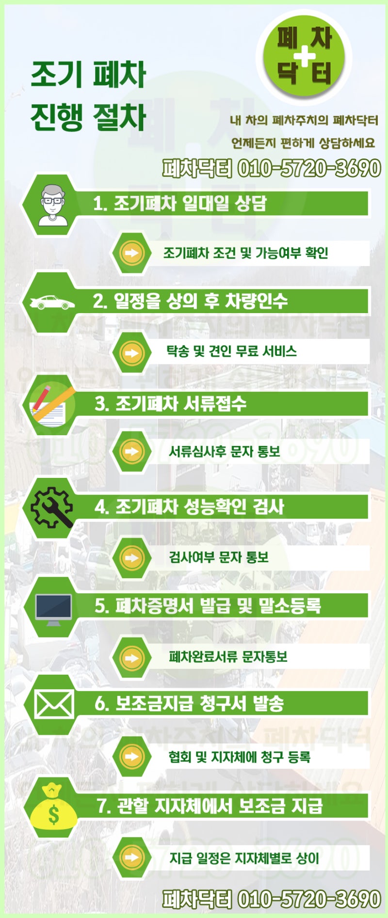 접수는 어디서 하면 현명하게 끝낼 수 있을까.2가지 방법으로 조기 폐차를 받을 수 있는 한국 자동차 환경 협회를 통해서 차주들이 직접 받거나 공식 지정된 관공서 폐차장을 통해서 접수할 수 있습니다. 환경 협회는 차량 해체 작업이나 말소 등록 같은 과정을 직접 하지 않고 접수 및 보상금에 관한 것만 관할하고 있어 귀찮은 일이 있습니다. 관허 센터의 경우 신청 후 취소 작업, 보조금 신청까지 모두 1곳에서 열리고 더 쉽고 편리하게 처리할 수 있습니다. 또 전담 직원이 할당되어 걸리는 부분은 즉각 확인하고 진행할 수 있습니다.준비해야 할 서류, 사실은 세입자님이 신경을 쓰고 준비해야 하는 것은 서류가 거의 전부라고 해도 과언이 아닙니다. 이것만 준비해서 보내시면 다음 과정부터 전문가가 스스로 하니 궁금한 것은 없습니다.개인 명의의 경우 자동차 등록증 원본과 신분증 사본, 통장 사본을 준비하세요.공동 명의의 경우는 이 밖에 보조금을 받지 않은 명의자의 위임장, 인감 증명서를 추가로 마련하세요. 법인 명의의 경우 사업자 등록증 사본과 자동차 등록증 원본, 법인 통장 사본 및 법인 등기부 등본, 법인 인감 증명서를 준비 주세요. 카피가 필요한 서류는 사진을 찍어서 보내시면 되고, 자동차 등록증의 경우 차 안에 넣어 두면 인도될 때에 안전하게 전달됩니다.앞 이미지 다음 이미지스타렉스 조기폐차 시 고철비 지급도 가능합니다.모든 차량이 폐차되면 특수한 상황이 발생하지 않는 한 모두 고철세를 받을 수 있습니다. 차량 압축 후 고철 무게 기준으로 당일 시세에 맞춰 지급하는 것이 기본인데요. 재활용이 가능한 곳은 재활용 가능한 모든 품목을 구축한 유통망을 통해 판매하고 그 수익으로 보다 풍부한 보상금을 받을 수 있습니다. 스타렉스의 경우 차체도 크고 무겁기 때문에 일반 승용차에 비해 더 많은 고철비를 기대하셔도 좋습니다.서류 심사에서 말소 작업, 보상금 지급까지 원스톱으로 열립니다.서류를 보내시면, 담당자가 직접 환경 협회에 접수를 완료하고 약 1~2주 안에 대상이 되는지를 확인하고 합격 여부와 최종적인 지원금까지 메일로 보냅니다. 앞으로 성능 검사 때문에 폐차장에 차를 보내시면 좋겠는데요. 차의 주인이 직접 가져오는 것이 아니라 편리한 일정을 어떻게 되면 담당 운전사가 방문해서 차를 가져오게 됩니다. 수수료와 비용이 전혀 들지 않고 차 열쇠만 지정된 장소에 두면 비대면에서 움직일 필요 없는 입하할 수 있습니다.차량이 입고되면 환경 협회에서 나온 검사관에 의해서 성능 검사가 행해지고 합격하자마자 말소 진행을 합니다. 말소증이 나면 메일이나 메일 등으로 건내, 말소 후에는 고철 값도 바로 지급됩니다. 지원금의 경우, 말소 날로부터 1개월 후에 제출된 계좌에 지급 받고 추가 지원금 대상에 해당하는 분은 기한 내에 신청 받을 수 있습니다.2021년 스타렉스 조기폐차를 하기 위한 조건부터 상향된 지원금까지 알아봤습니다. 예산은 한정되어 있고 많은 분들이 진행하고 있기 때문에 서둘러 접수를 하지 않으면 지원금을 놓치지 않을 것 같습니다. 다른 궁금한 사항은 언제든지 도와드릴테니 전화로 편하게 물어보세요.