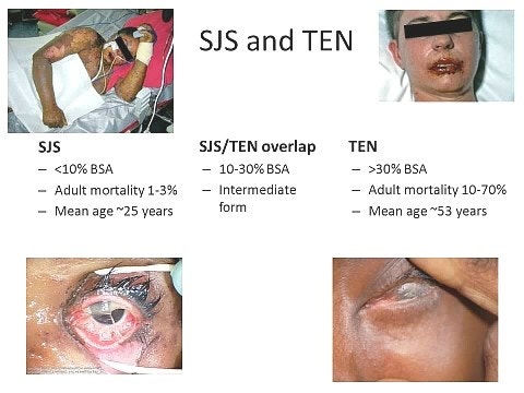 원인두질환 사망률이 높고 원인은 약제가 대부분이지만 청년 SJS는 미코플라즈마 등의 감염병이 주요 원인입니다.TEN은 SJS에서 진전하거나 이행에 달려 있습니다.sulfonamides, 항경련제, 비설폰아미드계 항생제, 항진균제 등이 원인 약재로 보고되고 있습니다.발생기전은 확실하지 않으며 표피독성 제거 시스템의 이상으로 비정상적인 약물대사가 유발됩니다. 따라서 각질 형성 세포에 독성으로 작용하거나 항원의 특성을 변형시킬 수 있습니다. 그 밖에 약물 또는 대사물이 각질 형성 세포를 표적으로 세포 독성 면역 반응의 방아쇠가 됩니다. 후천성 면역결핍 환자의 중독성 표피괴사융해증 발생률이 높습니다.