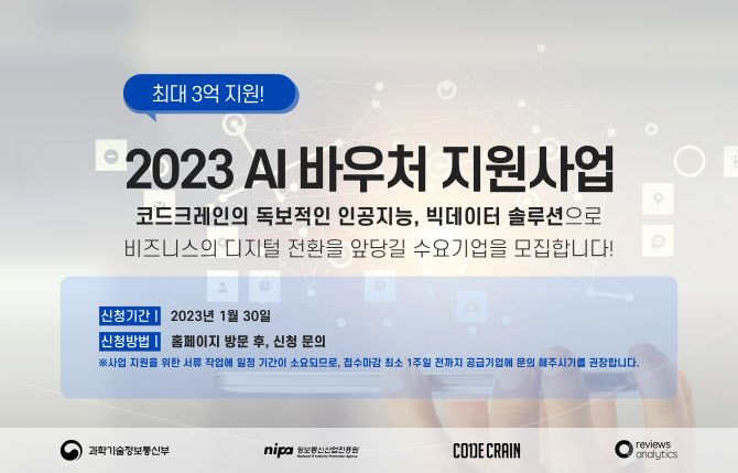 과학기술정보통신부는 중소기업/벤처기업/중견기업/의료기관 등에 인공지능 솔루션 적용을 지원하는 <2023년 AI 바우처 지원사업>의 시작을 발표하였습니다. <AI 바우처 지원사업>이란 국내 유망 AI 솔루션 공급기업이 관련 기술 적용이 필요한 수요기업에 솔루션 도입 및 적용에 필요한 지원을 주고 정부에서 바우처 형태로 지원하는 사업입니다. ‘국민과 함께 세계 모뎀이 되는 디지털 강국’을 만들기 위한 대규모 정부 지원으로 2023년에는 약 250개 내외 과제를 대상으로 최대 700억원이 투입될 예정입니다. 특히 지난해와 달리 2023년에는 AI 반도체 및 소상공인, 글로벌 분야 등 총 5개 분야로 확대 진행될 예정입니다.