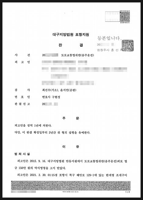 (2) Daegu District Court Western Branch – 3 teams out with 2 revolutions of drinking, 0.114% drunk driving, was in danger of being arrested, but prosecuted without detention