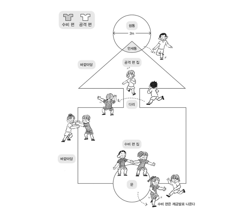 힘이 세고 빠른 사람이 꼬리부터 머리까지 수비를 피하거나 수비를 물리치고 빠르게 올라가면 이기는 게임.