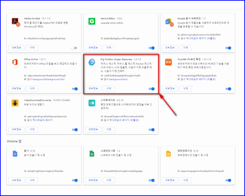 확장 프로그램을 선택하면 제 크롬 브라우저에 설치된 웹이 보입니다.그 중에는 피그툴바(Pig Toolbar)도 보입니다.자세한 내용을 볼 수 있고 삭제도 가능합니다.또 다른 건 없을까?알아보도록 하겠습니다.
