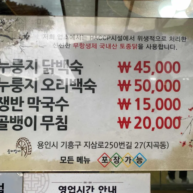 누룽지삼계탕 주문, 그런데 지금 보니까 누룽지 오리고기 백숙도 있었네요.언제부터 생겼는지 모르겠지만 이번에는 오리고기 백숙도 한번 먹어볼게요.기본반찬과 장비셋팅사이다나 다른 군더더기 없이 옛맛 그대로 나는 깔끔한 동치미로항상 최적의 조림 상태로 나오는 열무김치집게, 가위를 이용해서 먹기 좋은 크기로 썰어놓습니다.청양고추 매운 머리 쪽부터 한입 먹고산뜻 동치미 한 모금 마시면…멀리 셀프 코너 옆 냉장고에서 대기하고 있는 막걸리 한 잔이 생각나는데, 오늘은 무알코올에 도전하고 있습니다.대신 셀프코너에서 통 무껍질제거 한접시 리필그렇게 무껍질을 두 접시나 먹다 보면참기름 냄새를 풍기며 겉절이김치를 버무려누룽지를 씌운 토종 백숙도 나왔습니다.여기 물레방아에서 쓰는 닭은 납땜이라는 품종의 토종닭인데 우리가 흔히 생각하는 토종 백숙 뼈에 개체가 큰 품종이 아니기 때문에 두세 명이 먹기에 적당한 크기입니다.그래서 4명이서 팀에 오게 되면 주문을 어떻게 해야 할지 좀 고민이 되는데 다행히 오늘은 3명이니까 닭 한 마리면 충분할 것 같아요.치킨이든 백숙이든 항상 닭날개에….압력밥솥에 삶아 젓가락만으로 찢어질 정도로 부드럽고 감칠맛 나는 물레방아 누룽지백숙푸석푸석한 닭가슴살조차도 촉촉하고 부드럽습니다.사실 이 집의 하이라이트는 바로 이거예요.쫄깃하면서도 고소한 맛이 농축되어 있는 누룽지셋이서 지금까지 다 먹기는 좀 부담스러우니까 일부는 먹고 일부는 포장해 올게요.고춧가루를 제외한 모든 재료는 국산확인된 적은 없지만 아마 김치를 저 토굴에서 저온 숙성시키지 않을까 제 나름대로 생각해 보겠습니다.식사 후 커피 한 잔 들고 정원 한 바퀴 돌아도 돼요.싸온 누룽지닭죽은 나중에 데워 먹어도 첫맛 그대로 맛있게 먹을 수 있습니다. 기흥 지곡동 물레방아는 조용한 분위기도 좋고 거리도 멀지 않은 데다 맛도 좋아 항상 만족스러운 식사를 할 수 있습니다.제목에 자신 있게 맛집이라고 쓸 수 있는 몇 안 되는 집중 하나 나의 모든 블로그 포스팅은 아무런 대가도 뒷광고 없이 100% 내 돈을 지불하고 경험하고 느낀 내용만 작성합니다.50m 네이버 더보기 / 오픈스트리트맵지도데이터x 네이버 / 오픈스트리트맵지도컨트롤러 범례부동산대로읍,면,동시,군,구시,도국물레방아 경기도 용인시 기흥구 지삼로250번길 27* 이전 방문기용인 지곡동 물레방아 – 누룽지백숙 맛집 제법 따스한 햇살이 비친 주말 오후 용인 지곡동 누룽지물레방아에 왔습니다. 방문객 많아… m.blog.naver.com용인 지곡동 물레방아 – 누룽지백숙 맛집 제법 따스한 햇살이 비친 주말 오후 용인 지곡동 누룽지물레방아에 왔습니다. 방문객 많아… m.blog.naver.com용인 지곡동 물레방아 – 누룽지백숙 맛집 제법 따스한 햇살이 비친 주말 오후 용인 지곡동 누룽지물레방아에 왔습니다. 방문객 많아… m.blog.naver.com용인 지곡동 물레방아 – 누룽지백숙 맛집 제법 따스한 햇살이 비친 주말 오후 용인 지곡동 누룽지물레방아에 왔습니다. 방문객 많아… m.blog.naver.com