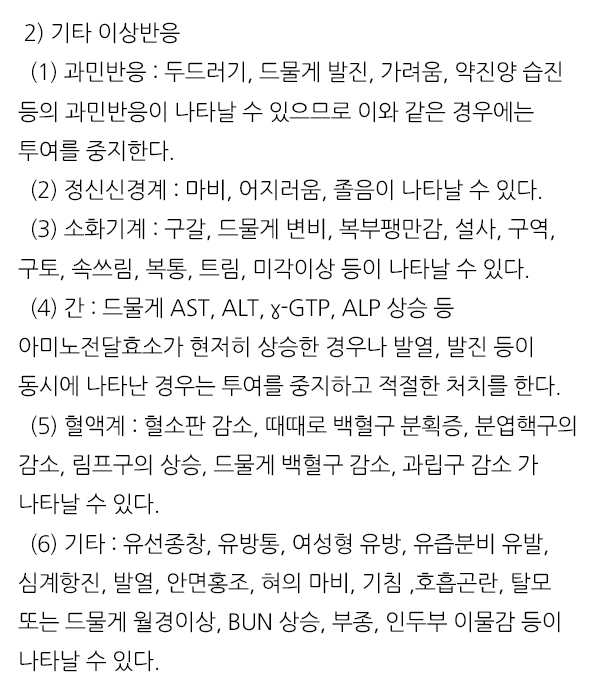 발진, 발적, 가려움증 등의 증상이 나타나면 전문가와 상담하십시오.과량으로 투여하지 않도록 주의하십시오.임산부, 수유부는 투여해서는 안 됩니다.