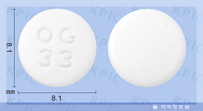 장축은 8.1mm, 단축은 8.1mm, 두께는 3.4mm의 크기를 가지고 있으며 흰색 원형정제로 OG33으로 표기되어 있습니다. 상호 작용