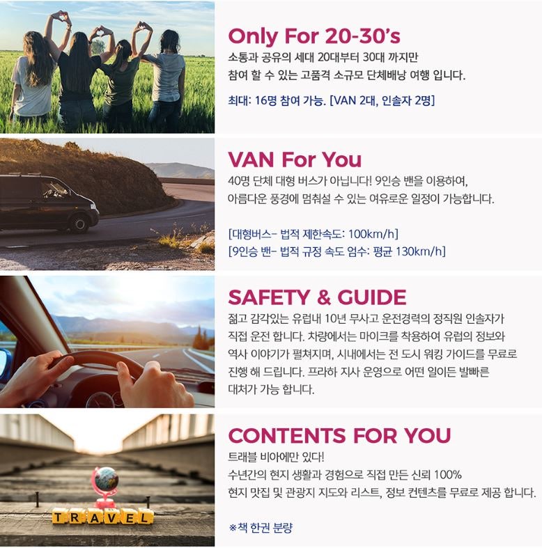 소규모 프리미엄 여행이므로 대형버스를 이용하는 다른 상품과 달리 9인승 VAN 2대를 이용하여 이동합니다.대형버스는 제한속도가 100km/h로 아무리 도로 사정이 좋아도 목적지까지 가는 거리와 시간이 매우 오래 걸립니다. 그러나 9인승 VAN을 이용하면 평균 속도 130km/h로 목적지까지의 시간이 매우 단축됩니다. 그리고 그 VAN을 트래블비아 전문 인솔자가 직접 운전합니다.곧! 유럽의 아름다운 풍경, 어디서나 멈춰서 사진을 찍을 여유가 생깁니다~!