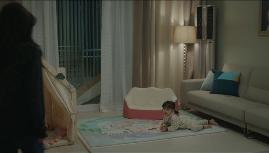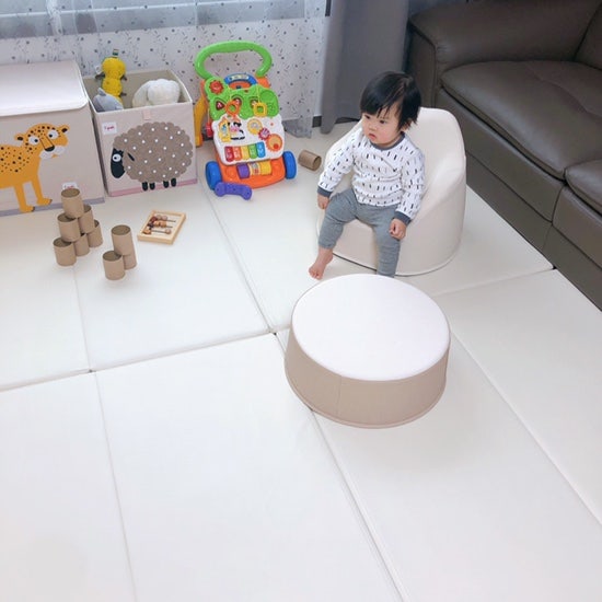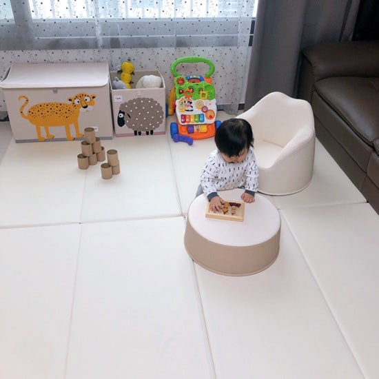 거실 창가 놀이매트 위에 아기 소파를 올려줬어요.가끔 일어나서 위험하게 놀기 때문에 만약을 위해 등받이는 벽 쪽에 기대는 것이 좋다고 생각하거든요.열심히 뛰어다녀서 창가에서 땀좀 식히도록ㅋ