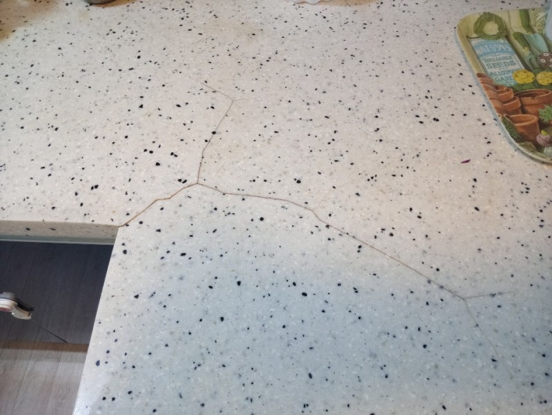 싱크대 상판이 인조대리석으로 제작되었습니다.사진으로는 잘 보이지 않지만 조리대 상판이 깨졌어요.싱크볼 왼쪽에 10cm 정도 균열이 가고 미세한 틈으로 물이 스며들어 있습니다.이렇게 되면 인공 대리석 상판 사이에 얼룩이 쌓여 곰팡이가 생길 수 있습니다.습하면 세균 번식이 쉬운 환경이기 때문에 위생적으로 좋지 않죠. 무엇보다 균열이 커질 수 있기 때문에 제대로 수리를 받아야 합니다.