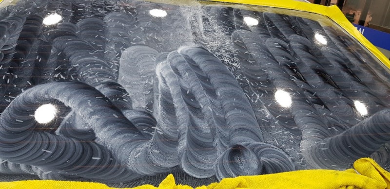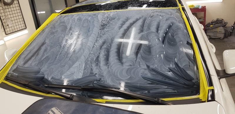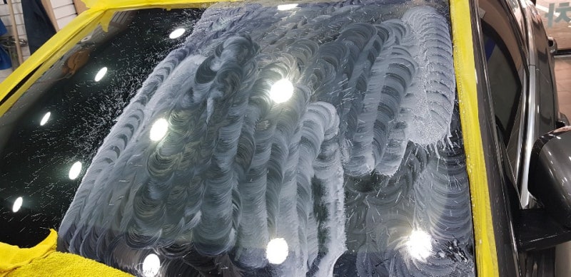 자동차 유리유막제거 노바스 강남점 컴파운드를 이용해 석회수를 시공하는 사진