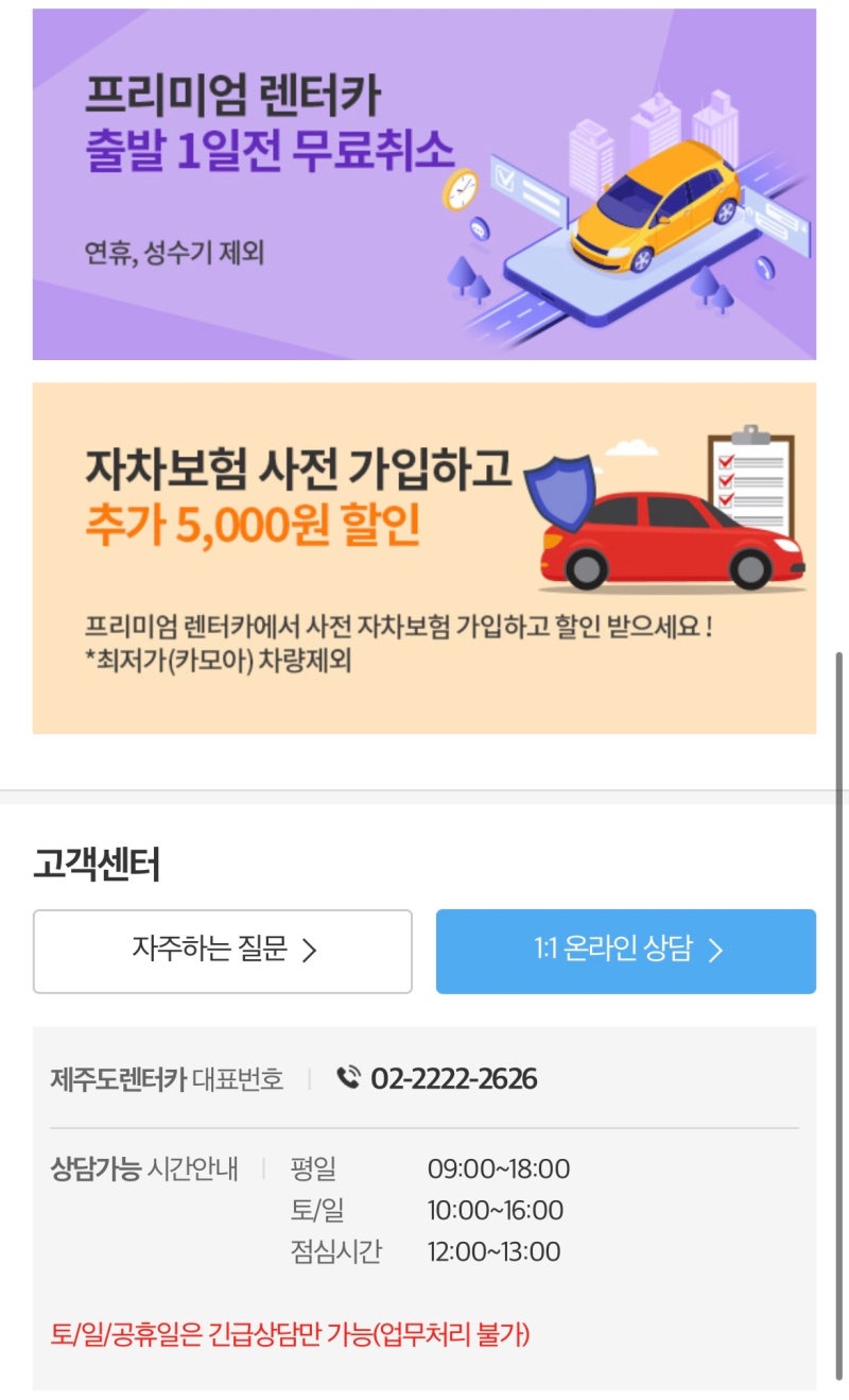 4. 프리미엄 렌터카 예약 시 출발 1일 전까지 무료 취소 5. 프리미엄 렌터카 사전 자차보험 가입 시 5000원 추가 할인 혜택 제주렌터카 20% 할인 + 보험료 5천원 할인