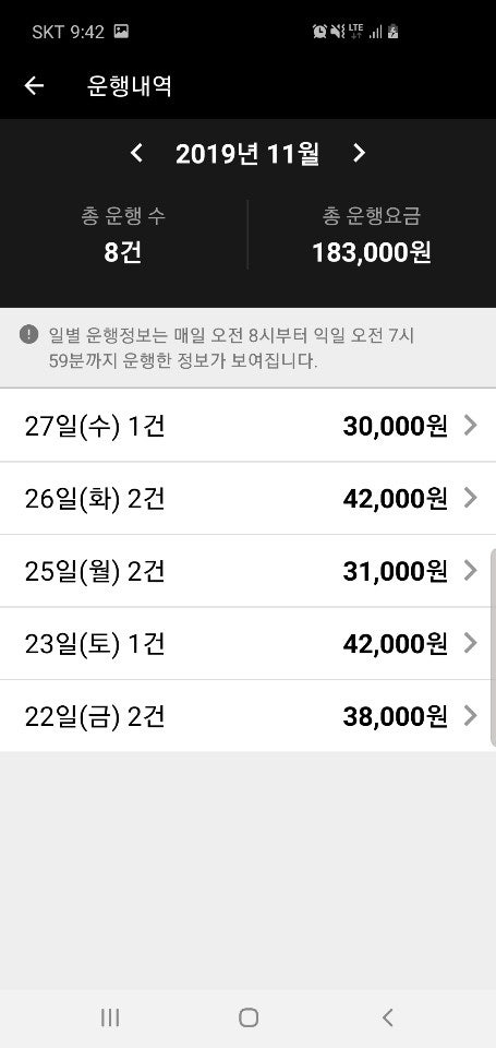 올해부터 플랫폼 노동자도 고용보험에 가입해야 하는데 월 소득이 80만원 이상은 돼야 한다는 점. 수입은 대략 다음과 같습니다. 수수료를 제외한 실수입이 표시되어 있습니다. 포인트로 지급되며 출금신청이 가능합니다. 거의 90% 카드 결제입니다. 현금결제의 경우 수수료는 포인트에서 차감됩니다.참고: 현재 포인트가 부족한 경우 현금 콜은 할 수 없습니다.