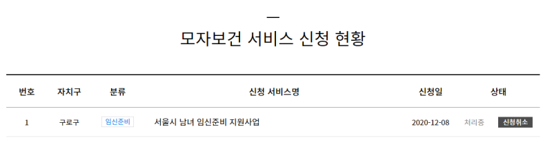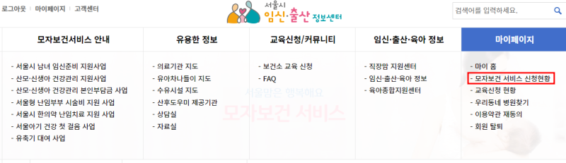 홈페이지 우측 마이페이지에서 모자보건서비스 신청 현황을 보실 수 있습니다.