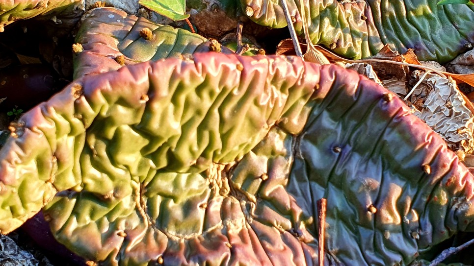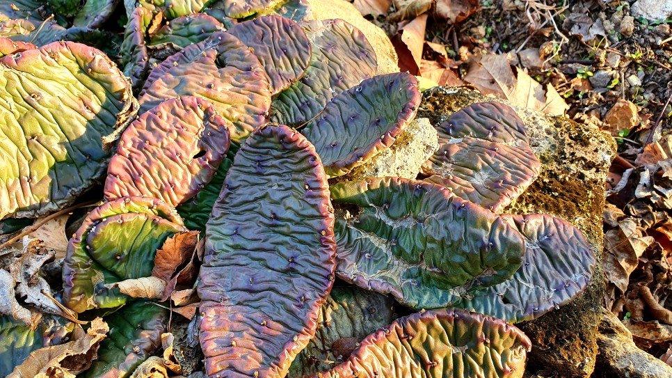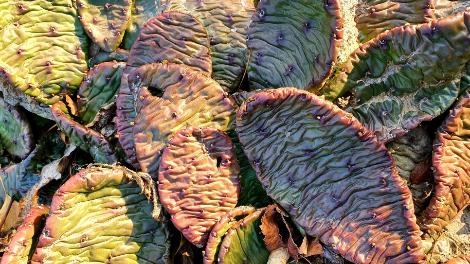 12월 들어 밤 기온은 영하의 날씨로 추위에 강하다는 천년초도 바짝 말라 있고, 줄기는 힘을 잃어 땅에 납작 엎드려 있는 모습입니다.언뜻 보면 거의 말라죽은 것처럼 보이지만 생명력은 그대로 두고 이 상태로 겨울을 나다가 봄이 되면 다시 제 모습을 찾습니다.