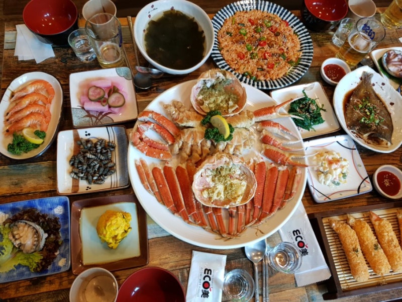 다행히 창가에 자리가 있어서 똑바로 착석하고 옷차림표부터 스캔해봤습니다.그리고 각종 스키다와 회, 대게찜이 나오는 대게 코스를 선택해서 요청했습니다.