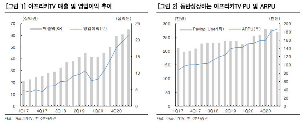 신한 금융 투자 연구원은 아프리카 TV의 주가 주식에 대해서 플랫폼 서비스, 광고 등 주요 사업의 지속적 성장을 예상한다며 투자 의견 인수(buy), 목표 주가 130,000원을 제시했습니다.신한 금융 투자 연구원은 “플랫폼 및 광고 등 주요 사업의 지속적 성장세가 예상되며 주식 가격 상승이 심했지만 실적 상승세가 더욱 치열한 하반기 광고 고도 성장이 시작되면 밸류에이션 리 레이팅도 가능하다”고 밝혔습니다.계속”이번 2021년 제2분기 매출액과 영업 이익은 각각 전 분기 대비 6.0%, 8.0%증가하는 컨센서스에 부합할 것이다”며”플랫폼 서비스 매출은 525억원으로 전 분기 높은 기저에도 성장이 지속될 전망”이라고 분석했습니다.동시에 “사용자 활동성이 높아지는 BJ사용자 간 유대가 형성됐으며 한 사람당 평균 결제 금액(ARPPU)유료 결제 비율(Paying ratio)모두 지속적으로 상승하고 있다”고 덧붙였다.그는 “몇년간 플랫폼 서비스 후원 시스템 성장에 대해서 의문을 갖고 있던 투자가가 존재했지만 지금은 우려를 포기할 때가 됐다”이라며 후원 문화가 보편화하는 회사의 결제률도 지속 증가하는 경향”이라고 진단했습니다.그는 “AMM도입과 함께 광고주 수 증가와 직접 판매 비중 증가가 확인됐으며 매 분기 광고 성장이 전망되지만 하반기에는 본격적으로 실시간 방송 내 중간 광고가 도입된 광고 성장세가 거세질 전망”이라고 전했습니다.신한금융투자 연구원은 아프리카TV 주가 주식에 대해 플랫폼 서비스, 광고 등 주요 사업의 지속적인 성장을 예상한다며 투자의견 매수(buy), 목표주가 130,000원을 제시했습니다.신한금융투자 연구원은 “플랫폼 및 광고 등 주요 사업의 지속적인 성장세가 예상돼 주식가격 상승이 심했지만 실적 상승세가 더 가팔라 하반기 광고고 성장이 시작되면 밸류에이션 리레이팅도 가능하다”고 설명했습니다.이어 “이번 2021년 2분기 매출액과 영업이익은 각각 전분기 대비 6.0%, 8.0% 증가해 컨센서스에 부합할 것”이라며 “플랫폼 서비스 매출은 525억원으로 전분기 높은 기저에도 성장이 지속될 전망”이라고 분석했습니다.그러면서 “사용자 활동성이 높아지고 BJ 사용자 간 유대감이 형성되면서 1인당 평균결제금액(ARPPU), 유료결제비율(Paying ratio) 모두 지속적으로 상승하고 있다”고 덧붙였다.그는 “몇 년간 플랫폼 서비스 후원 시스템 성장에 대해 의구심을 가졌던 투자자들이 존재했지만 이제는 우려를 접을 때가 됐다”며 후원 문화가 보편화되면서 회사 결제율도 지속 증가하는 추세”라고 진단했습니다.그는 “AMM 도입과 함께 광고주 수 증가와 직접판매 비율 증가가 확인되고 있어 매 분기 광고 성장이 전망되지만 하반기에는 본격적으로 실시간 방송 내 중간광고가 도입되면서 광고 성장세가 가팔라질 전망”이라고 전했습니다.신한금융투자 연구원은 아프리카TV 주가 주식에 대해 플랫폼 서비스, 광고 등 주요 사업의 지속적인 성장을 예상한다며 투자의견 매수(buy), 목표주가 130,000원을 제시했습니다.신한금융투자 연구원은 “플랫폼 및 광고 등 주요 사업의 지속적인 성장세가 예상돼 주식가격 상승이 심했지만 실적 상승세가 더 가팔라 하반기 광고고 성장이 시작되면 밸류에이션 리레이팅도 가능하다”고 설명했습니다.이어 “이번 2021년 2분기 매출액과 영업이익은 각각 전분기 대비 6.0%, 8.0% 증가해 컨센서스에 부합할 것”이라며 “플랫폼 서비스 매출은 525억원으로 전분기 높은 기저에도 성장이 지속될 전망”이라고 분석했습니다.그러면서 “사용자 활동성이 높아지고 BJ 사용자 간 유대감이 형성되면서 1인당 평균결제금액(ARPPU), 유료결제비율(Paying ratio) 모두 지속적으로 상승하고 있다”고 덧붙였다.그는 “몇 년간 플랫폼 서비스 후원 시스템 성장에 대해 의구심을 가졌던 투자자들이 존재했지만 이제는 우려를 접을 때가 됐다”며 후원 문화가 보편화되면서 회사 결제율도 지속 증가하는 추세”라고 진단했습니다.그는 “AMM 도입과 함께 광고주 수 증가와 직접판매 비율 증가가 확인되고 있어 매 분기 광고 성장이 전망되지만 하반기에는 본격적으로 실시간 방송 내 중간광고가 도입되면서 광고 성장세가 가팔라질 전망”이라고 전했습니다.