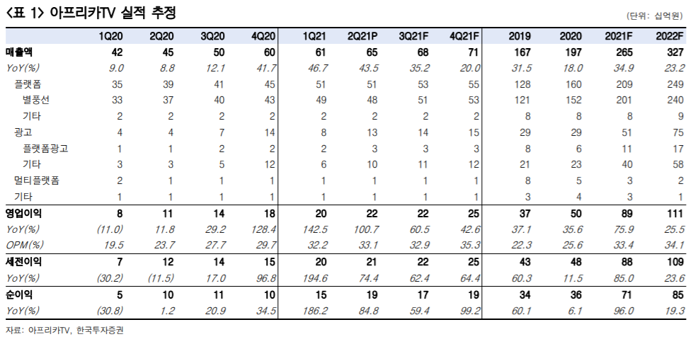 신한 금융 투자 연구원은 아프리카 TV의 주가 주식에 대해서 플랫폼 서비스, 광고 등 주요 사업의 지속적 성장을 예상한다며 투자 의견 인수(buy), 목표 주가 130,000원을 제시했습니다.신한 금융 투자 연구원은 “플랫폼 및 광고 등 주요 사업의 지속적 성장세가 예상되며 주식 가격 상승이 심했지만 실적 상승세가 더욱 치열한 하반기 광고 고도 성장이 시작되면 밸류에이션 리 레이팅도 가능하다”고 밝혔습니다.계속”이번 2021년 제2분기 매출액과 영업 이익은 각각 전 분기 대비 6.0%, 8.0%증가하는 컨센서스에 부합할 것이다”며”플랫폼 서비스 매출은 525억원으로 전 분기 높은 기저에도 성장이 지속될 전망”이라고 분석했습니다.동시에 “사용자 활동성이 높아지는 BJ사용자 간 유대가 형성됐으며 한 사람당 평균 결제 금액(ARPPU)유료 결제 비율(Paying ratio)모두 지속적으로 상승하고 있다”고 덧붙였다.그는 “몇년간 플랫폼 서비스 후원 시스템 성장에 대해서 의문을 갖고 있던 투자가가 존재했지만 지금은 우려를 포기할 때가 됐다”이라며 후원 문화가 보편화하는 회사의 결제률도 지속 증가하는 경향”이라고 진단했습니다.그는 “AMM도입과 함께 광고주 수 증가와 직접 판매 비중 증가가 확인됐으며 매 분기 광고 성장이 전망되지만 하반기에는 본격적으로 실시간 방송 내 중간 광고가 도입된 광고 성장세가 거세질 전망”이라고 전했습니다.신한금융투자 연구원은 아프리카TV 주가 주식에 대해 플랫폼 서비스, 광고 등 주요 사업의 지속적인 성장을 예상한다며 투자의견 매수(buy), 목표주가 130,000원을 제시했습니다.신한금융투자 연구원은 “플랫폼 및 광고 등 주요 사업의 지속적인 성장세가 예상돼 주식가격 상승이 심했지만 실적 상승세가 더 가팔라 하반기 광고고 성장이 시작되면 밸류에이션 리레이팅도 가능하다”고 설명했습니다.이어 “이번 2021년 2분기 매출액과 영업이익은 각각 전분기 대비 6.0%, 8.0% 증가해 컨센서스에 부합할 것”이라며 “플랫폼 서비스 매출은 525억원으로 전분기 높은 기저에도 성장이 지속될 전망”이라고 분석했습니다.그러면서 “사용자 활동성이 높아지고 BJ 사용자 간 유대감이 형성되면서 1인당 평균결제금액(ARPPU), 유료결제비율(Paying ratio) 모두 지속적으로 상승하고 있다”고 덧붙였다.그는 “몇 년간 플랫폼 서비스 후원 시스템 성장에 대해 의구심을 가졌던 투자자들이 존재했지만 이제는 우려를 접을 때가 됐다”며 후원 문화가 보편화되면서 회사 결제율도 지속 증가하는 추세”라고 진단했습니다.그는 “AMM 도입과 함께 광고주 수 증가와 직접판매 비율 증가가 확인되고 있어 매 분기 광고 성장이 전망되지만 하반기에는 본격적으로 실시간 방송 내 중간광고가 도입되면서 광고 성장세가 가팔라질 전망”이라고 전했습니다.신한금융투자 연구원은 아프리카TV 주가 주식에 대해 플랫폼 서비스, 광고 등 주요 사업의 지속적인 성장을 예상한다며 투자의견 매수(buy), 목표주가 130,000원을 제시했습니다.신한금융투자 연구원은 “플랫폼 및 광고 등 주요 사업의 지속적인 성장세가 예상돼 주식가격 상승이 심했지만 실적 상승세가 더 가팔라 하반기 광고고 성장이 시작되면 밸류에이션 리레이팅도 가능하다”고 설명했습니다.이어 “이번 2021년 2분기 매출액과 영업이익은 각각 전분기 대비 6.0%, 8.0% 증가해 컨센서스에 부합할 것”이라며 “플랫폼 서비스 매출은 525억원으로 전분기 높은 기저에도 성장이 지속될 전망”이라고 분석했습니다.그러면서 “사용자 활동성이 높아지고 BJ 사용자 간 유대감이 형성되면서 1인당 평균결제금액(ARPPU), 유료결제비율(Paying ratio) 모두 지속적으로 상승하고 있다”고 덧붙였다.그는 “몇 년간 플랫폼 서비스 후원 시스템 성장에 대해 의구심을 가졌던 투자자들이 존재했지만 이제는 우려를 접을 때가 됐다”며 후원 문화가 보편화되면서 회사 결제율도 지속 증가하는 추세”라고 진단했습니다.그는 “AMM 도입과 함께 광고주 수 증가와 직접판매 비율 증가가 확인되고 있어 매 분기 광고 성장이 전망되지만 하반기에는 본격적으로 실시간 방송 내 중간광고가 도입되면서 광고 성장세가 가팔라질 전망”이라고 전했습니다.