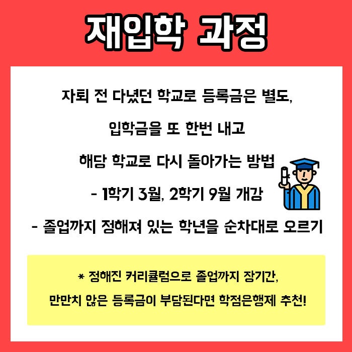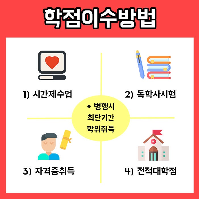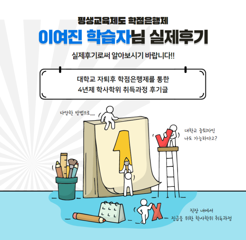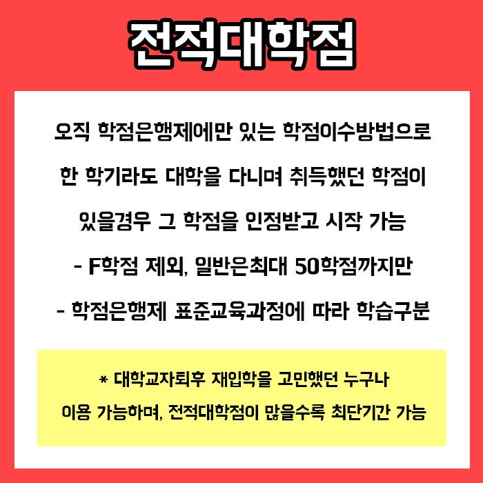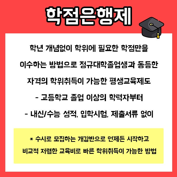 대학에 가지 않으면 성공할 수 없다!라는 말이 학생들에게 크게 새겨지고 있습니다. 그러다가 나의 진로와 미래를 생각하는 학생들보다는 그냥 대학이라는 제목만을 생각하고 대학에 진학하는 경우가 너무 많아요.이처럼 자신의 진로와 상관 없이 대학에 진학할 경우 자신이 생각한 모습과 많이 다르고 적성과 맞지 않아 고생하고 입학했으나 자퇴하는 경우가 많습니다.대학의 경우 아무래도 진학을 하면 끝까지 다니는 것이 취업에 더 좋으니 대학 중퇴를 권하지 않지만, 자신에 맞지 않는다고 생각하면 재학할 시간이 힘들게 품고 있어 그만두고 자신에 대해서 다시 한번 뒤돌아보면 좋겠습니다!학점 은행제 학사 학위 취득 때 졸업 학점을 모두 충족시킬 필요 없이 부족한 것만 이수하면 좋아서 갖고 있는 단위만 학위 취득 기간과 비용을 줄일 수 있는 장점이 있습니다.학점 은행제에서 학사 학위를 취득한 뒤 자신이 생각했던 원하는 전공 혹은 대학에 편입하는 방법도 있습니다. 을 선택하면 경제적 비용을 줄일 수 있는 단기간에 학위 취득자 수에 최적인 방법입니다.요즘은 대학에 들어가도 자신이 생각하던 곳과 크게 다르고 혼란하고 자퇴하는 경우가 많습니다. 여러가지 방법이 많아 죽지 않고 자신들이 원하는 진로를 찾기를 바라면서, 포스팅을 마치겠습니다. 도움이 된다면 다행입니다~^^아래를 클릭하면 무료 상담 창구에 접속합니다!