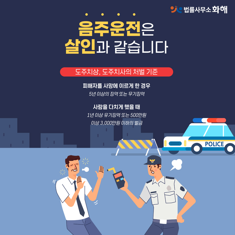 음주운전은 강화된 규제로 인해 초범이라도 가벼운 처벌을 받기가 쉽지 않아 재범일 경우 실형을 받을 가능성이 매우 높습니다.따라서 사고 피해자의 상해 정도, 혈중 알코올 농도 수치, 사고 후 운전자의 대응 등에 따라 처벌기준이 크게 달라지므로 가급적 경찰 조사를 받기 전 전문 변호사의 꼼꼼한 상담을 받아 대처하시기 바랍니다.