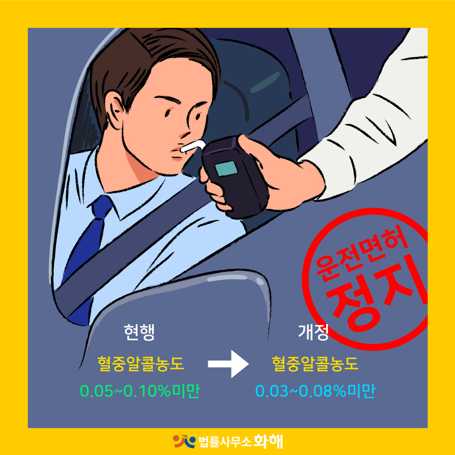 면허정지 기준은 혈중알코올농도 종전 0.05%에서 0.03%로, 면허취소 기준은 0.1%에서 0.08%로 하향 조정되며 음주운동을 2회 적발했을 때도 면허취소 처분을 받게 됩니다.