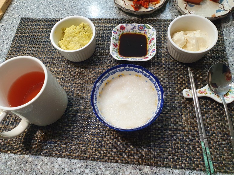 서방님이 직접 만드신 미음, 계란찜, 유도우후. 하지만 이렇게 부드러운 음식도 목구멍으로 넘기기가 힘들었어요. ( ´ ; ω ; ` )