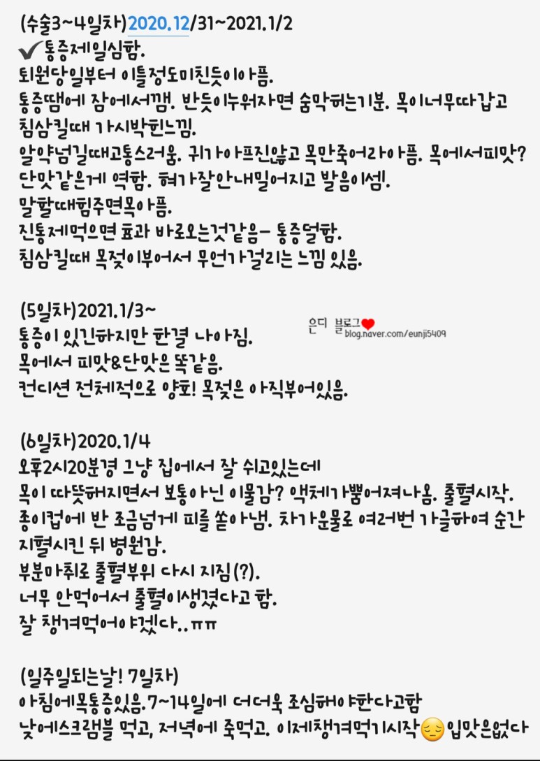 9일째부터는 상태가 확 좋아져서 안썼어요!♥은디가 만든 Q&A ♥1. 수술비용?대학병원&개인병원에 따라 다르며 입원실 인원, 입원일수에 따라 다르다.입원일? 보통 1~3일 3. 수술 후에 말할 수 있는가?말을 할 수 있지만 길게 말하면 목 통증 가급적 말을 안 하는 게 추천!4. 수술후 추천음식?냉죽이나 아이스크림처럼 차갑고 순한 음식 <우유에 적신 카스테라, 연두부, 계란찜, 푸딩, 요구르트, 냉소바, 아침해 등… 회복기? 약 2주간 <개인차 있음> 6. 출혈시 대처법?얼음물로 가글, 냉찜질 <*혈관 수축→출혈 방지> 출혈이 심하면 바로 병원으로! 7. 주의해야 할 음식?딱딱하고 뜨거운 음식, 맵고 짠 자극적인 음식 <탄산음료, 사과주스 X> 8. 술, 담배 가능? 흡연, 음주 절대 X 음압으로 빨대 사용 금지! 9. 통증 때문에 잠을 못 자나?너무 아픈 경우는 진통제를 먹는 것을 추천 <약의 효과가 빠른 편> 똑바로 자면 답답한 느낌이 들기 때문에 옆으로 자는 것을 추천! 10. 수술 시간?30~40분. 회복시간까지 약 1시간 <전신마취> 11. 마시지 않으면 출혈발생?상처가 골고루 아물어야 출혈이 생기지→상처를 골고루 아물려면 잘 먹어야 한다.★잘 먹으면 빠르게 회복됩니다 ★ 편도절제수술 리뷰는 나름대로 작성해 본 Q&A로 포스팅을 마무리하겠습니다.∩∩