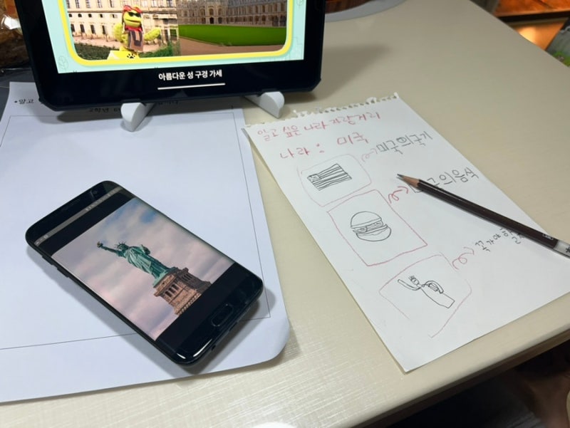 주말 숙제로 알고 싶은 나라 자랑거리를 알아가야 해. 지후는 미국에 대해 알아보고 싶어해.국기도 기억하고 있네. 미국 음식은 햄버거를, 그리고 미국에 가야 할 곳은 자유의 여신상.