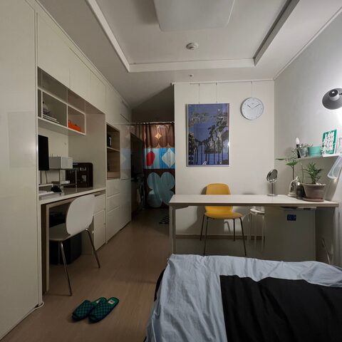 좁은 원룸 인테리어에서 가장 중요한 것은 꼭 있어야 할 부분과 그렇지 않은 것을 구분하는 것입니다.아마 이 집의 사용자는 푹신한 침대를 가장 소중히 여겼을 것입니다.저도 제일 중요한 걸 고르자면 푹신한 침대거든요.집이라는 게 휴식을 취하고 재충전하는 곳이잖아요.다른 벽은 맞춤형 수납장이 마련되어 있지만 침대와 소파 벽에는 액자와 선반으로 심플하게 장식되어 있어 편안한 휴식을 취할 수 있는 공간입니다.