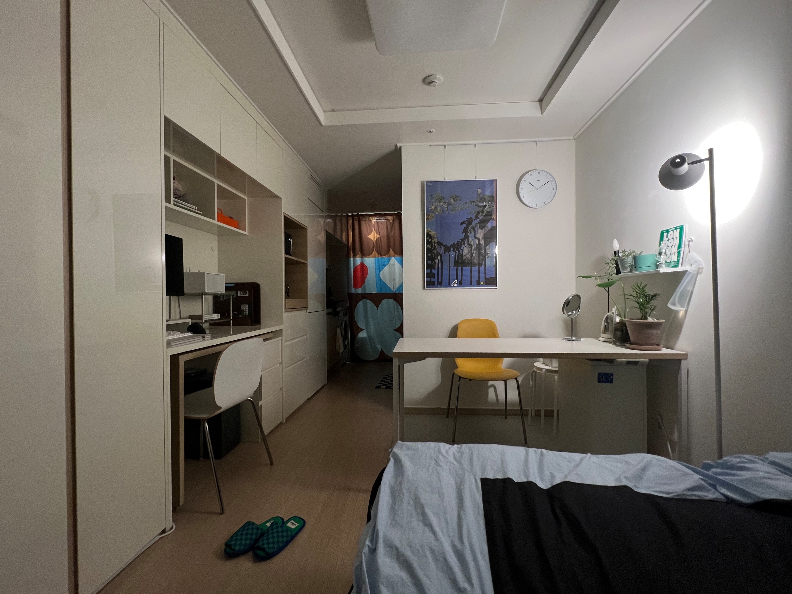 좁은 원룸 인테리어에서 가장 중요한 것은 꼭 있어야 할 부분과 그렇지 않은 것을 구분하는 것입니다.아마 이 집의 사용자는 푹신한 침대를 가장 소중히 여겼을 것입니다.저도 제일 중요한 걸 고르자면 푹신한 침대거든요.집이라는 게 휴식을 취하고 재충전하는 곳이잖아요.다른 벽은 맞춤형 수납장이 마련되어 있지만 침대와 소파 벽에는 액자와 선반으로 심플하게 장식되어 있어 편안한 휴식을 취할 수 있는 공간입니다.